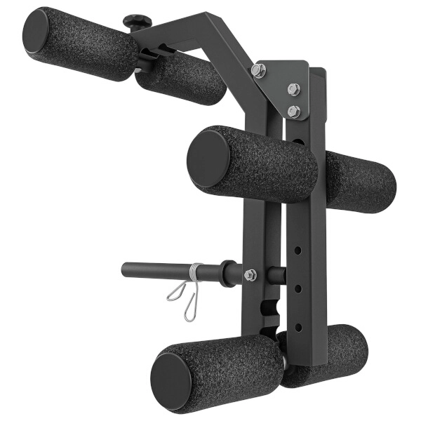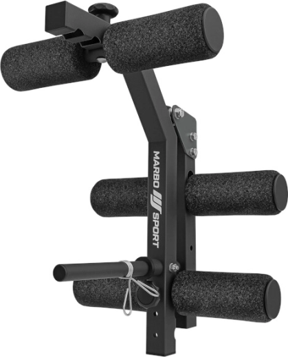 Pour un confort maximal, tous les points de contact sont équipés de rouleaux en mousse EVA qui conservent leur forme même lors d’entraînements intensifs. Les butées de pieds supérieures et inférieures se règlent sur 3 positions à l’aide d’une vis ergonomique, les rouleaux sous les genoux disposent de 2 niveaux, et l’adaptateur lui‑même offre 3 positions de hauteur : vous adaptez ainsi facilement l’amplitude et la technique. La broche de chargement de 21 cm de long et 25 mm de diamètre est compatible avec les disques courants jusqu’à 36 cm de diamètre.
