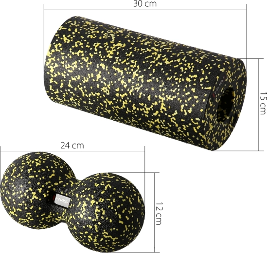 Avec cet ensemble polyvalent HMS, vous massez efficacement tout le corps – des pieds et des avant‑bras jusqu’au dos, aux fessiers ou au cou. Le grand rouleau sert à dissiper les tensions musculaires sur de grandes zones, le mini rouleau est idéal pour les pieds et les bras, la balle double (peanut) cible les groupes musculaires profonds le long de la colonne vertébrale et les épaules, et la balle individuelle atteint précisément les points gâchettes.