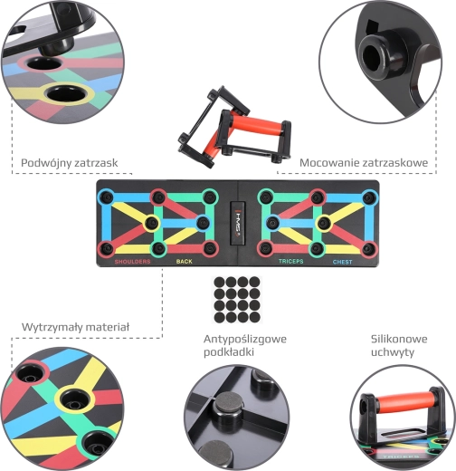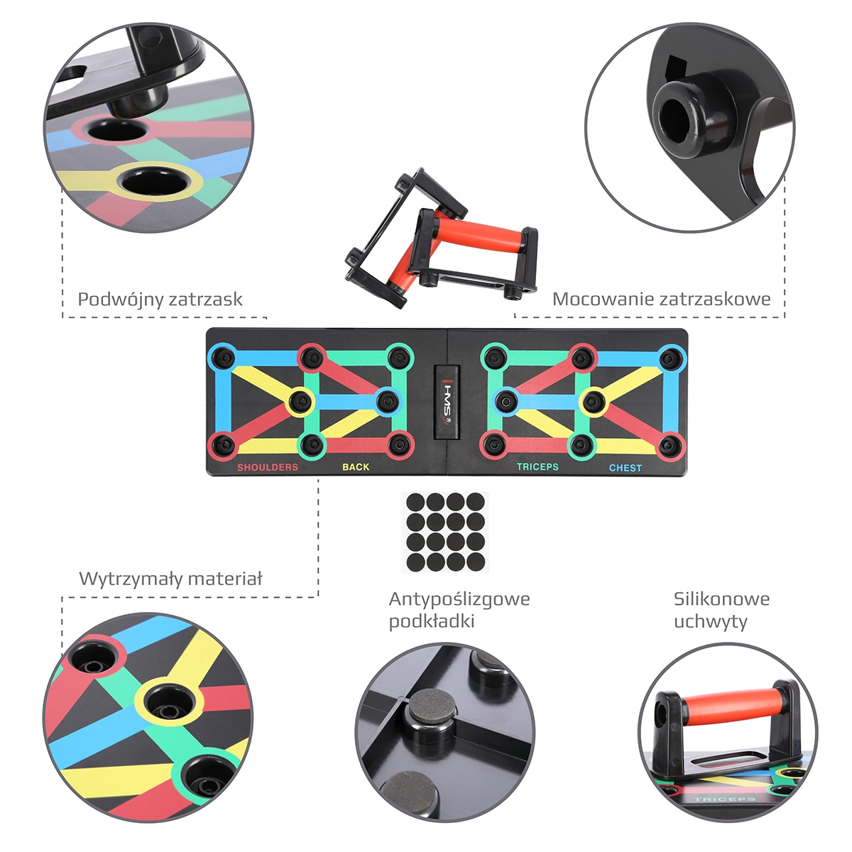 La HMS PU12 est une planche pliable et ingénieuse pour pompes, avec 8 paires d’orifices et un marquage coloré pour un positionnement précis des mains. Les différents angles de prise activent des groupes musculaires spécifiques : vert pour les triceps, jaune pour le dos, rouge pour les épaules et la poitrine, bleu pour différentes variantes de travail des pectoraux. Les poignées antidérapantes et la base en plastique robuste assurent une sécurité à chaque répétition.