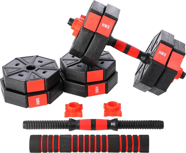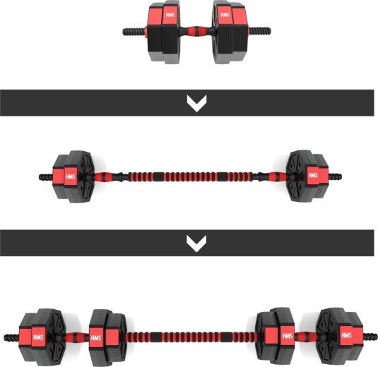 Le set HMS SGC15 est une solution complète pour l’entraînement à domicile : les deux haltères peuvent être rapidement transformés en barre grâce à l’élément de jonction. Des disques résistants en PVC remplis de ciment et des barres filetées avec serrages étoile garantissent la stabilité des charges pendant l’exercice. De plus, la forme hexagonale empêche les disques de rouler.