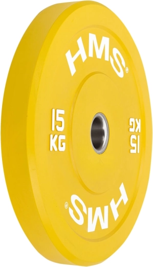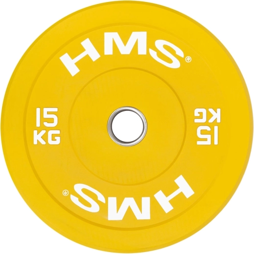 Disque bumper professionnel coloré HMS de 15 kg pour l'haltérophilie et l'entraînement fonctionnel. Grâce à sa gomme résistante et à son insertion centrale en inox, il protège le sol et la barre, réduit le bruit lors des lâchers et est pleinement compatible avec les barres olympiques de 50 mm. La finition jaune correspond au codage couleur de compétition pour une identification rapide à l’entraînement.