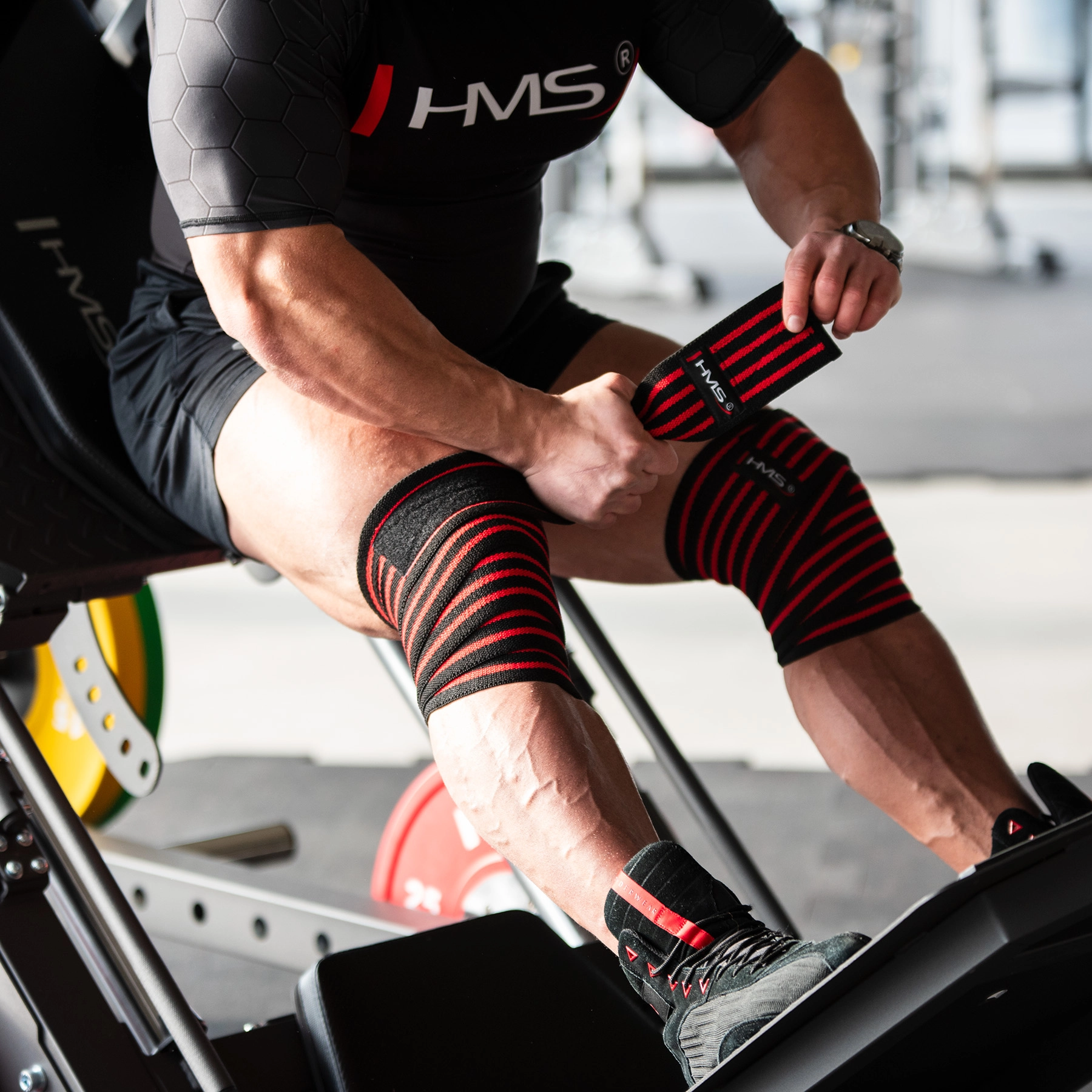 Les bandages maintiennent les genoux dans la bonne position, améliorent la stabilité et soutiennent la technique du squat et du leg press sous forte charge.