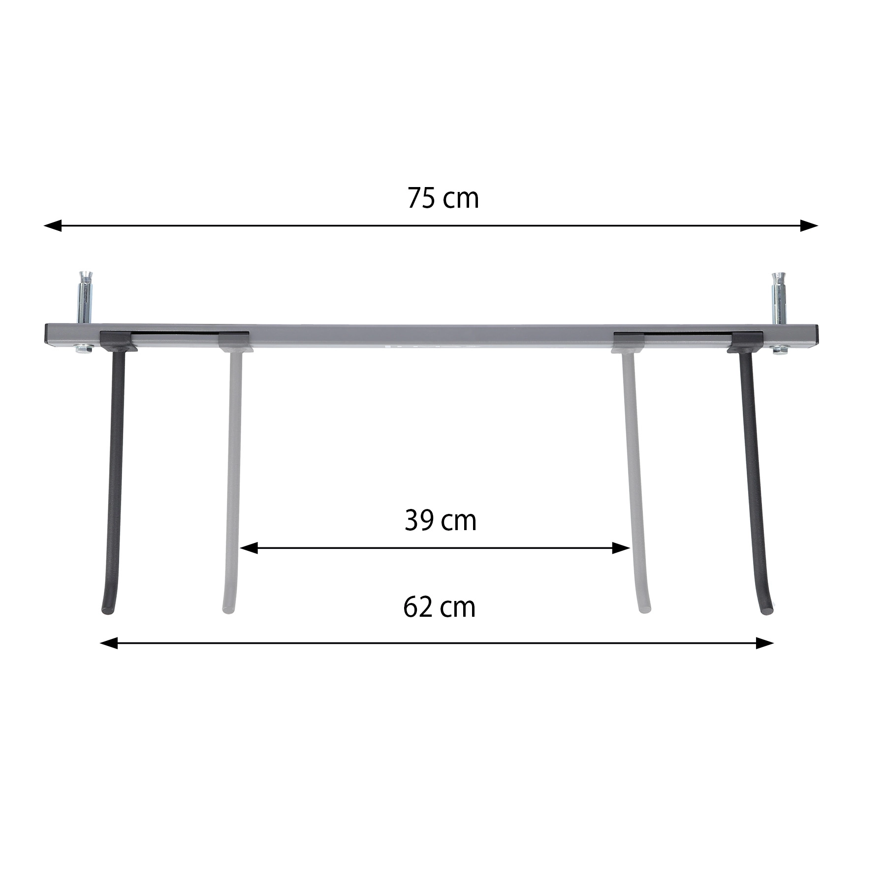 Des crochets de 25 cm de long et un entraxe réglable de 39 à 62 cm permettent de suspendre jusqu’à 16 tapis (selon l’épaisseur) et d’adapter le support à différents types de tapis avec œillets.