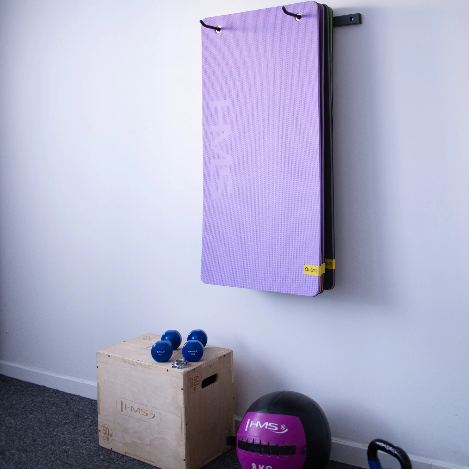Le support mural pour tapis HMS STR30 garde les tapis hors du sol, économise de l’espace et assure l’ordre dans la salle de sport, le studio ou le bureau. Sa construction en acier résistante et l’entraxe étudié des crochets (39–62 cm) facilitent la suspension de différents types de tapis avec œillets.