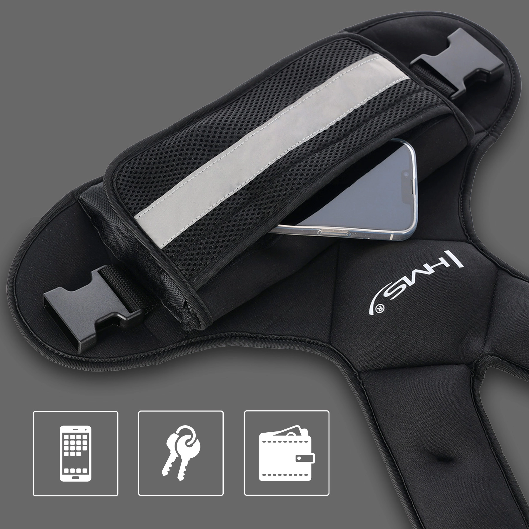 Une poche avant en maille élastique pratique accueille téléphone, clés ou petits objets, tandis que le néoprène résistant à la transpiration et les sangles réglables assurent un maintien sûr et confortable. Des éléments réfléchissants augmentent la sécurité lors des séances en extérieur par faible visibilité.