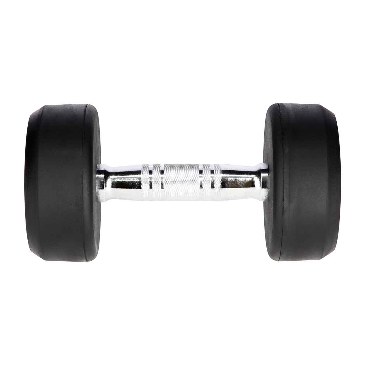 Des têtes en fonte recouvertes d’une épaisse couche de caoutchouc protègent l’haltère et le sol, amortissent les chocs et réduisent le bruit lors de la pose.
