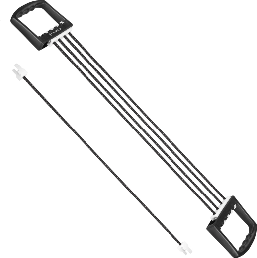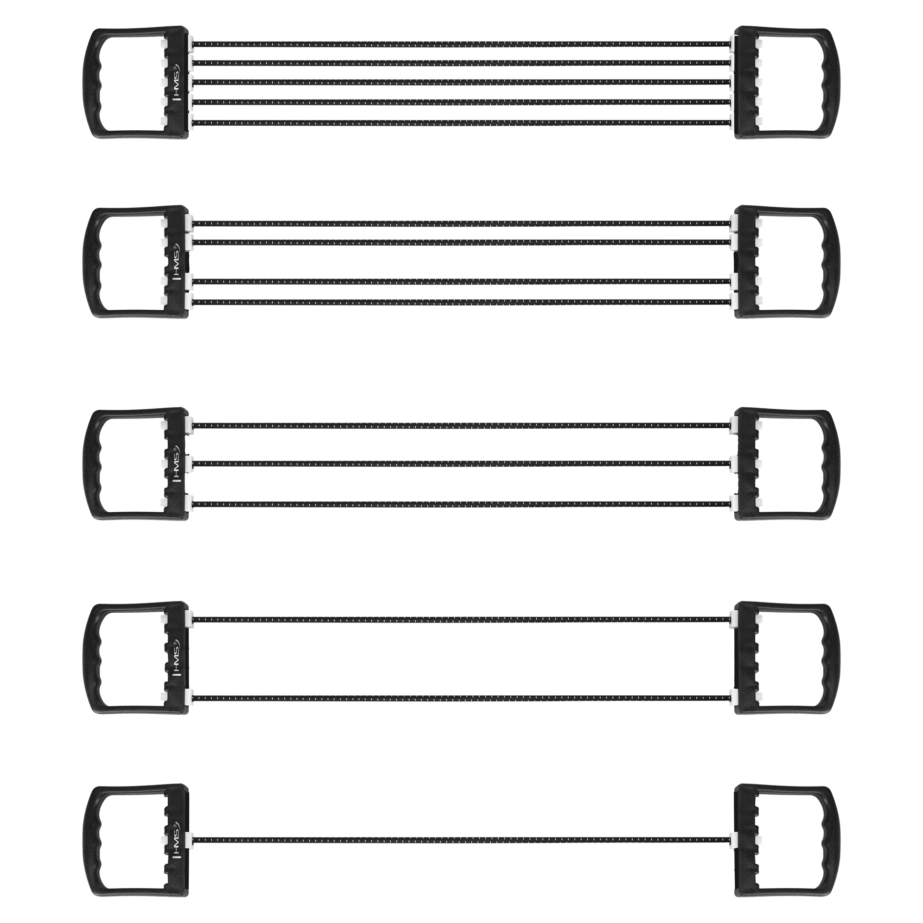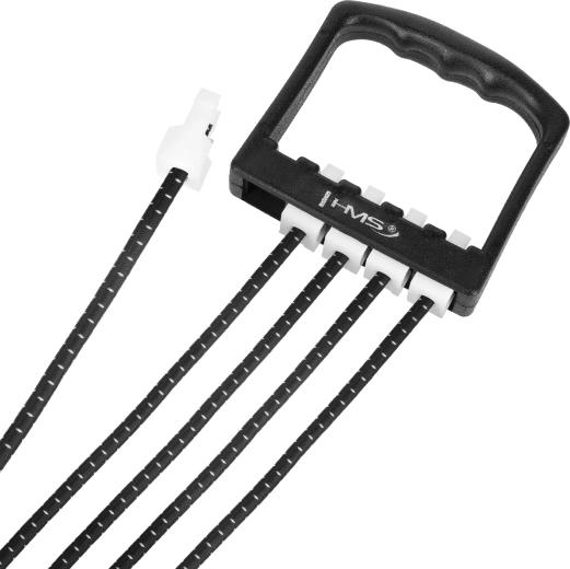 Expandeur élastique universel HMS avec cinq cordes interchangeables pour l’entraînement du haut du corps. Grâce à la possibilité d’enlever ou d’ajouter des cordes, vous réglez facilement une résistance variable pour le renforcement des bras, du dos et de la poitrine, mais aussi pour les exercices de rééducation. Des poignées antidérapantes ergonomiques en plastique résistant assurent une prise sûre et un confort optimal à l’entraînement, à la maison comme en déplacement.