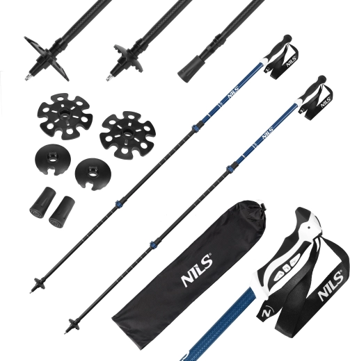 Le pack comprend deux jeux de rondelles, des embouts en caoutchouc pour les pointes et une housse de transport NILS – prêt pour les sentiers, la neige et le transport.