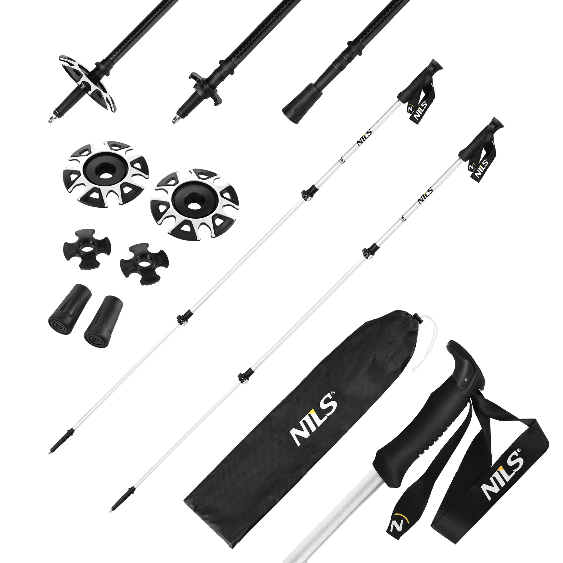 Les poignées en mousse EVA ergonomiques réduisent la fatigue des mains, évacuent bien la transpiration et offrent une tenue sûre même par temps humide. Le pack comprend deux jeux de rondelles, des embouts en caoutchouc et un sac de transport – vous êtes ainsi prêt pour diverses surfaces et saisons.
