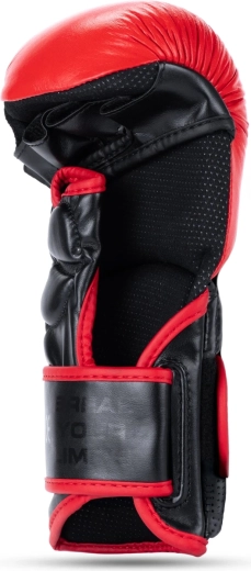 La zone de frappe est en cuir bovin naturel de haute qualité pour une grande durabilité, tandis que le manchon est en cuir synthétique renforcé innovant pour une fixation ferme. Un évidement étudié au niveau du velcro évite les accrochages et ouvertures involontaires lors du grappling. L’intérieur des gants est doté d’une doublure lisse pour un confort sans frottements.