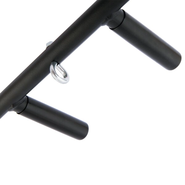 Le cadre en acier massif avec une finition peinture époxy résiste à l’usure, et les poignées en caoutchouc offrent une prise sûre et confortable. Le œillet central pratique élargit l’utilisation de la barre – vous pouvez y suspendre par exemple un sac de boxe, des bandes de résistance ou des sangles TRX.