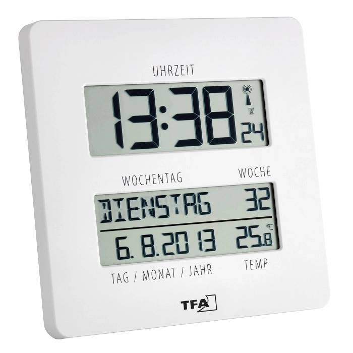 Les horloges numériques TFA TimeLine sont une aide fiable pour un aperçu quotidien. La synchronisation automatique par signal radio garantit une heure toujours précise sans réglage manuel. Leur grand écran à fort contraste est parfaitement lisible même à distance, ce qui sera particulièrement apprécié par les seniors et dans les lieux très fréquentés.