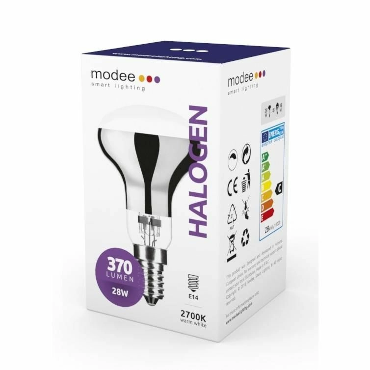 Ampoule halogène économique Modee avec culot E14 et puissance de 28 W offrant une lumière blanc chaud 2700 K, une pleine luminosité immédiate, un flux lumineux dimmable et un large angle de faisceau de 120°. Grâce à une conception spéciale avec revêtement réfléchissant IR, elle offre un meilleur rendement et convient à tout luminaire avec culot E14.