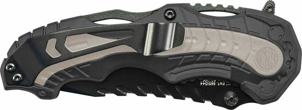 Couteau EDC polyvalent SMITH & WESSON M&P avec ouverture assistée M.A.G.I.C., doté d’une lame robuste Tanto en acier inoxydable 4034 avec finition noire, d’un tranchant partiellement dentelé (40 %) et d’un Liner Lock fiable. Le manche en aluminium avec inserts en caoutchouc assure une prise en main sûre, complété par un clip de poche et un brise-vitre pour les situations d’urgence.