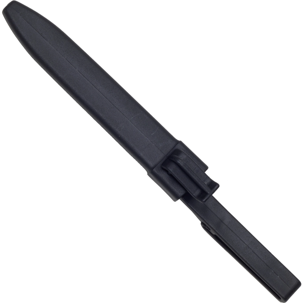 La poignée en polymère résistant est ergonomique, avec des rainures antidérapantes pour une prise ferme et confortable, même avec des gants. La garde protège la main de tout glissement vers la lame, et l’œillet pour cordon permet l’attache ou la suspension. Livré avec un étui en plastique léger et robuste pour un port en toute sécurité.