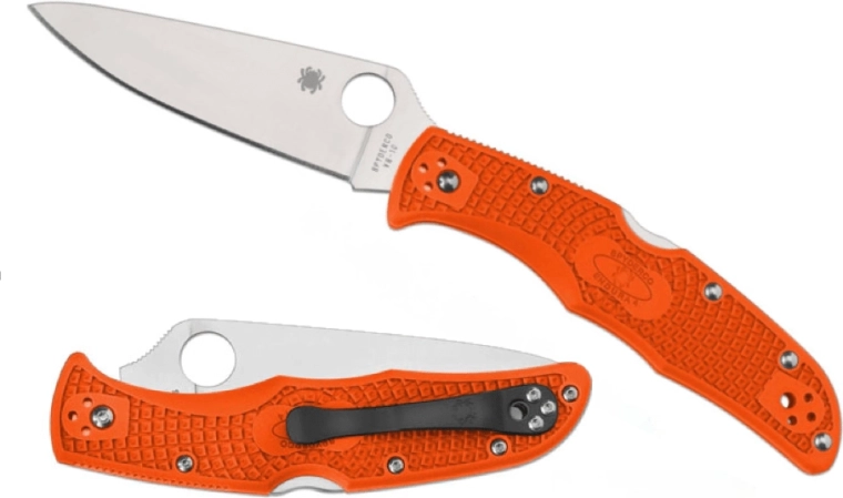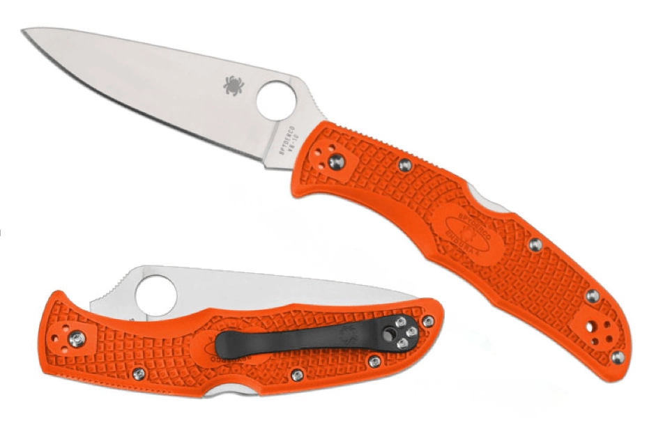 Couteau de poche Spyderco Endura 4 Flat Ground léger et robuste, en coloris orange, idéal pour le port EDC quotidien comme pour les pêcheurs. Il offre un tranchant lisse en acier japonais de qualité VG-10 avec une finition satinée, un verrou Back Lock fiable et une prise sûre grâce au manche texturé en FRN.