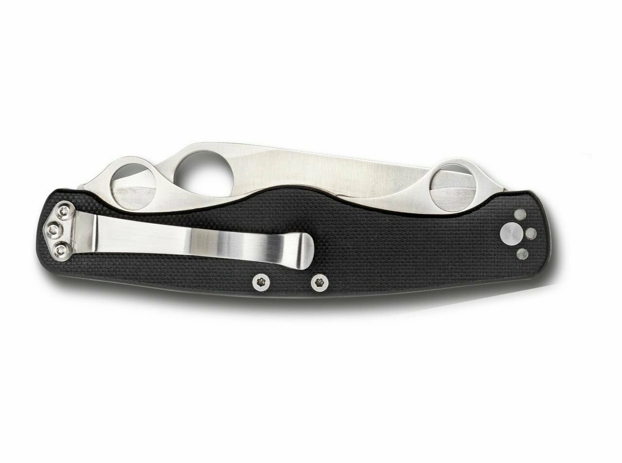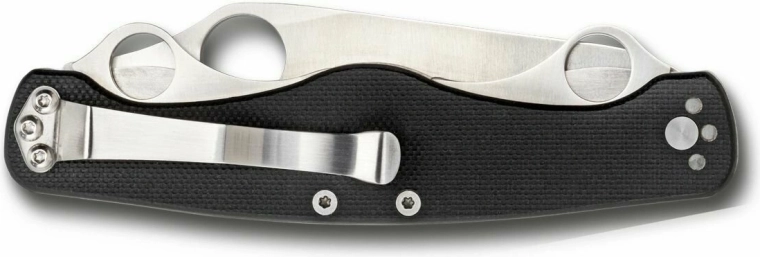 La poignée en composite G-10 de couleur noire est renforcée par des plaquettes en acier pour une plus grande robustesse. Le clip de poche à deux positions facilite le port au quotidien et l’accès rapide.