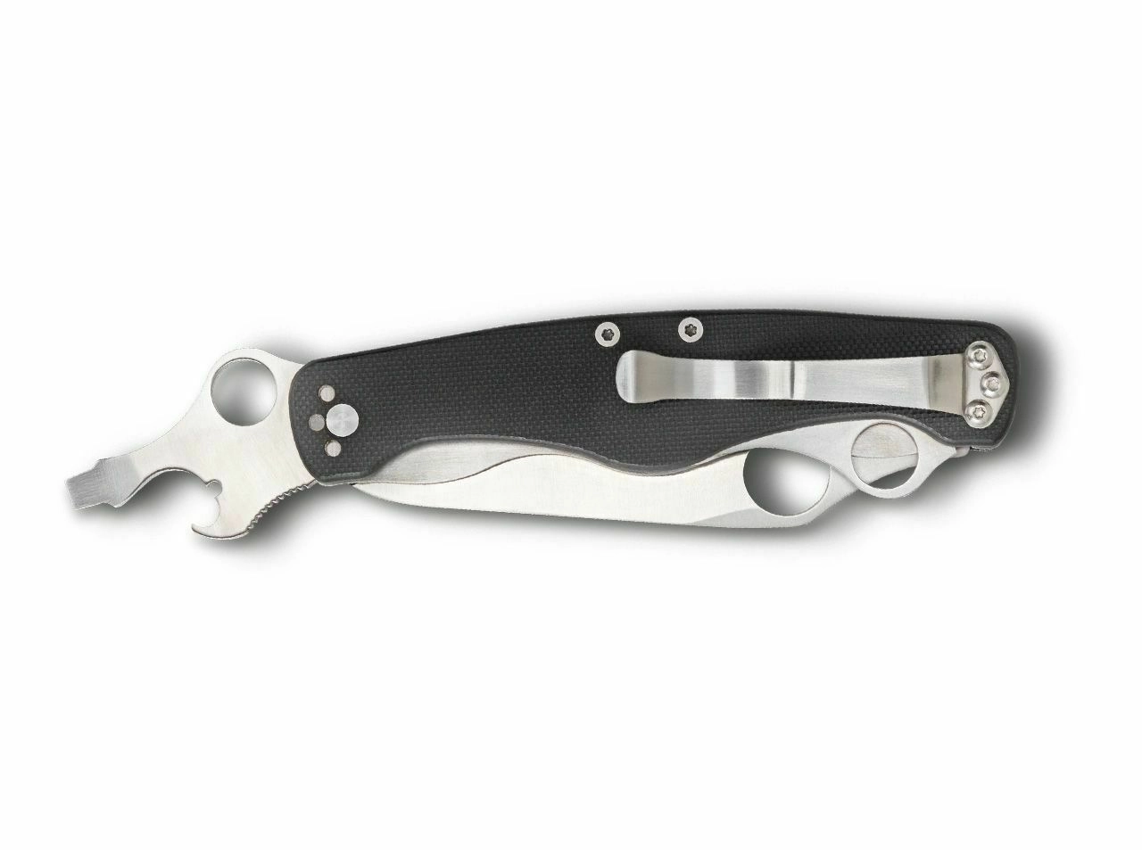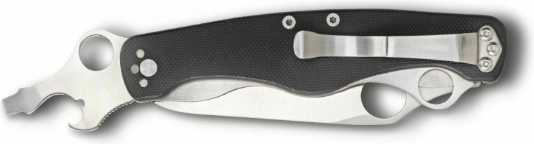 La première lame auxiliaire intègre un ouvre-boîte et un petit tournevis. La seconde propose un tournevis plus grand, un ouvre-bouteille et une encoche pour dénuder les fils. Ces outils ne sont pas verrouillables, mais sont soutenus par de puissants ressorts avec des arrêts à mi-course à 90° pour un meilleur levier lors du vissage. Toutes les lames sont en même acier 8Cr13MoV et disposent de trous ronds pour une ouverture aisée.