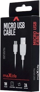 Câble blanc universel Maxlife avec connecteur micro USB pour une charge et un transfert de données rapides et stables. Il prend en charge la charge rapide 2 A, offre une longueur de 1 m pour une utilisation pratique et, grâce à sa construction flexible, il est durable et facile à utiliser avec les smartphones, powerbanks, écouteurs et enceintes.