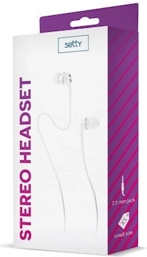Écouteurs intra-auriculaires SETTY légers et confortables, de couleur blanche, pour écouter de la musique depuis des téléphones et des lecteurs équipés d’un connecteur 3,5 mm. Ils offrent un son stéréo clair, un mini‑jack universel 3,5 mm et un câble de 1 m pour une utilisation pratique. Les écouteurs ne sont pas équipés d’un microphone.