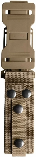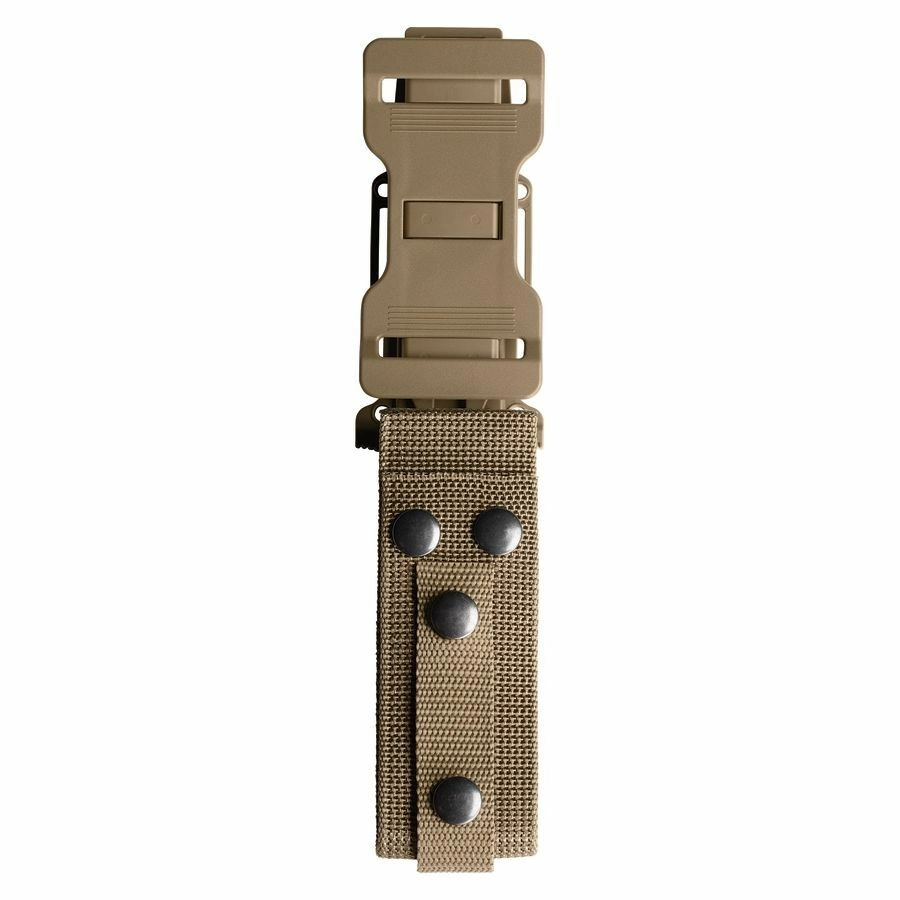 La poignée ergonomique en FRN couleur coyote avec texture diamant garantit une prise sûre et confortable, même mouillée ou avec des gants. À son extrémité se trouvent un trou pour dragonne et un brise-vitre pratique pour les situations d’urgence. L’emballage comprend un étui en plastique durci et nylon, compatible MOLLE, permettant une fixation horizontale ou verticale sur ceinture, sac à dos ou gilet tactique.