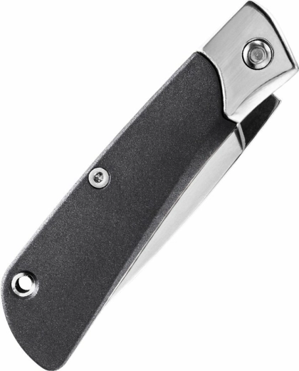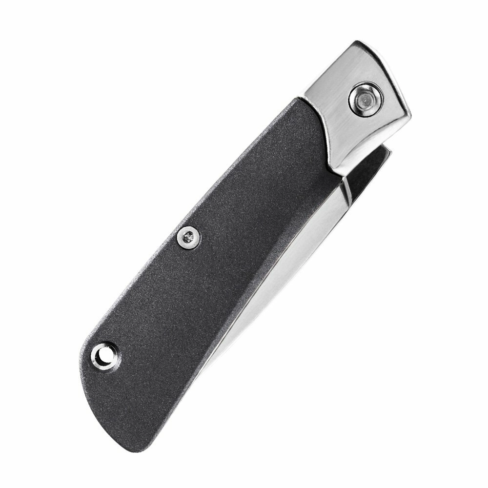 Le manche en aluminium anodisé résistant, de couleur grise, est léger, agréable en main et complété par un trou pour cordon. Le couteau est dépourvu de clip de poche, ce qui le rend discret et compact dans une poche ou un sac. Un excellent choix pour les minimalistes et tous ceux qui apprécient la simplicité et la fonctionnalité.