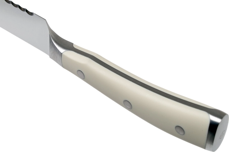 La poignée crème en POM, à trois rivets et construction full tang, garantit une prise sûre et une excellente stabilité lors de la coupe.