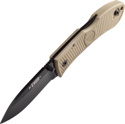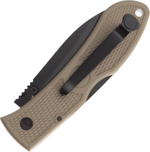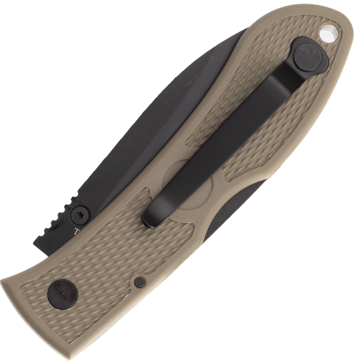 Les plaquettes texturées en Zytel, teinte Coyote Brown, offrent une prise sûre même mouillée. Le téton de pouce permet une ouverture à une main, le clip de poche se remonte de l’autre côté et l’œillet pour cordon élargit les options de port. Excellente solution EDC pour la ville, le travail et les sorties.