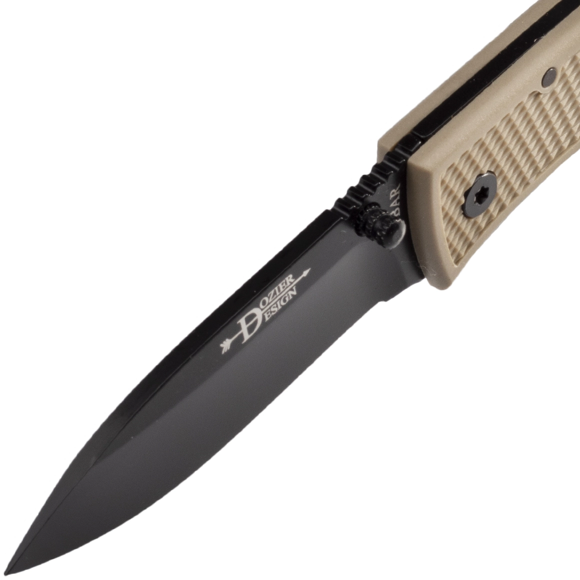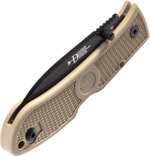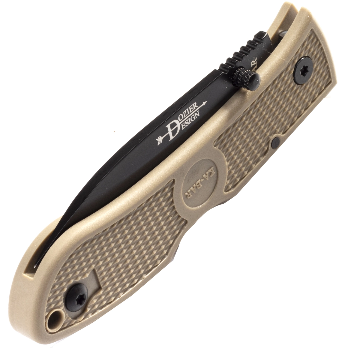 Couteau EDC léger et fiable pour un usage quotidien. KA-BAR Dozier Hunter avec lame noire en acier AUS-8A, verrou de sécurité Back Lock et manche robuste en Zytel couleur Coyote Brown, offrant une ouverture à une main confortable et une excellente prise en main.