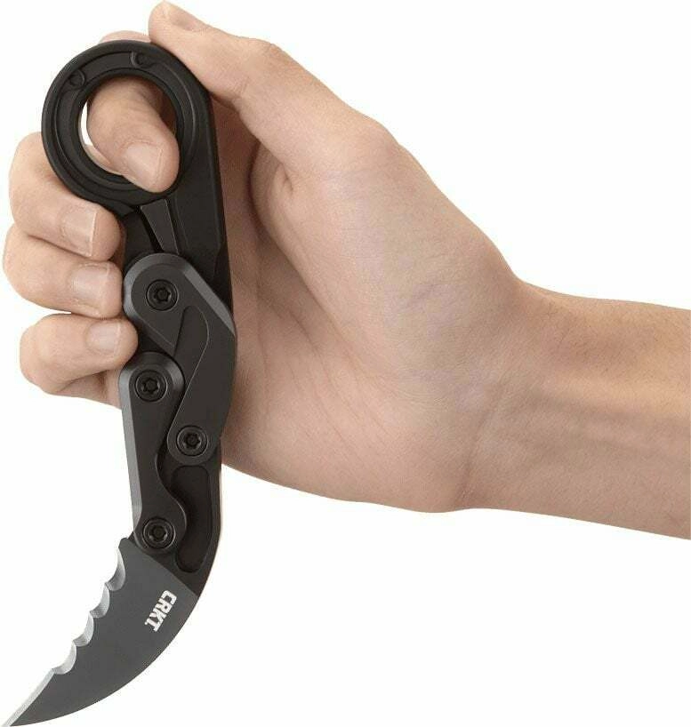 Le crantage spécial Veff améliore nettement les performances de coupe dans les matériaux fibreux, tandis que l’anneau de karambit garantit une prise sûre et un contrôle optimal du couteau. La poignée en aluminium aéronautique 6061-T6 avec clip de poche profilé, activé par une légère pression du pouce, favorise un port discret et un dégainage rapide.