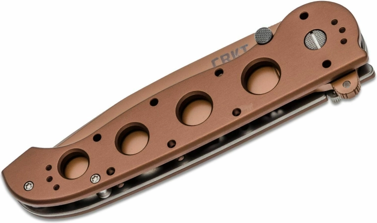 La poignée en aluminium anodisé 6061-T6, en teinte cuivre, offre un faible poids, une prise sûre et des trous d’allègement pour un meilleur équilibre.