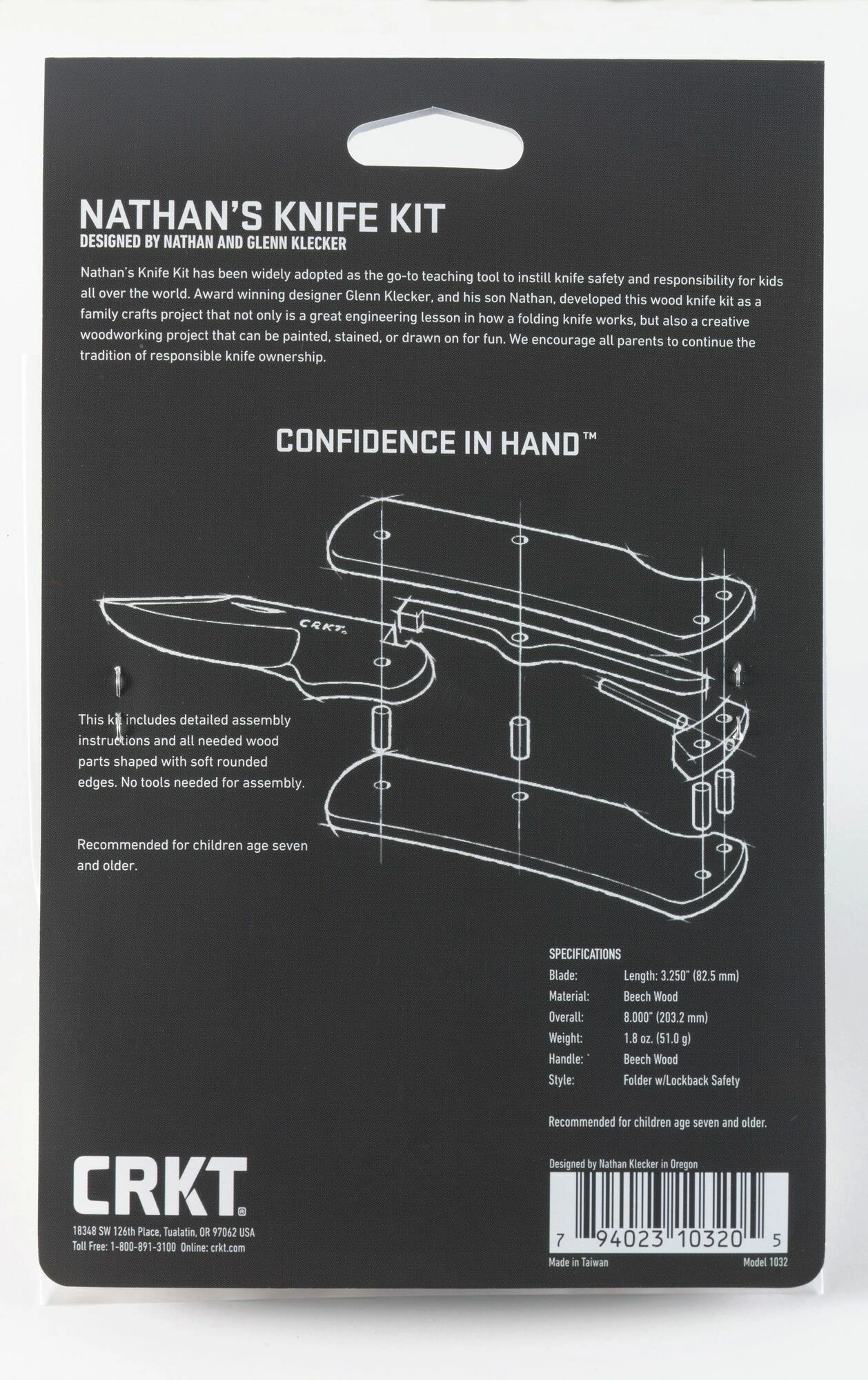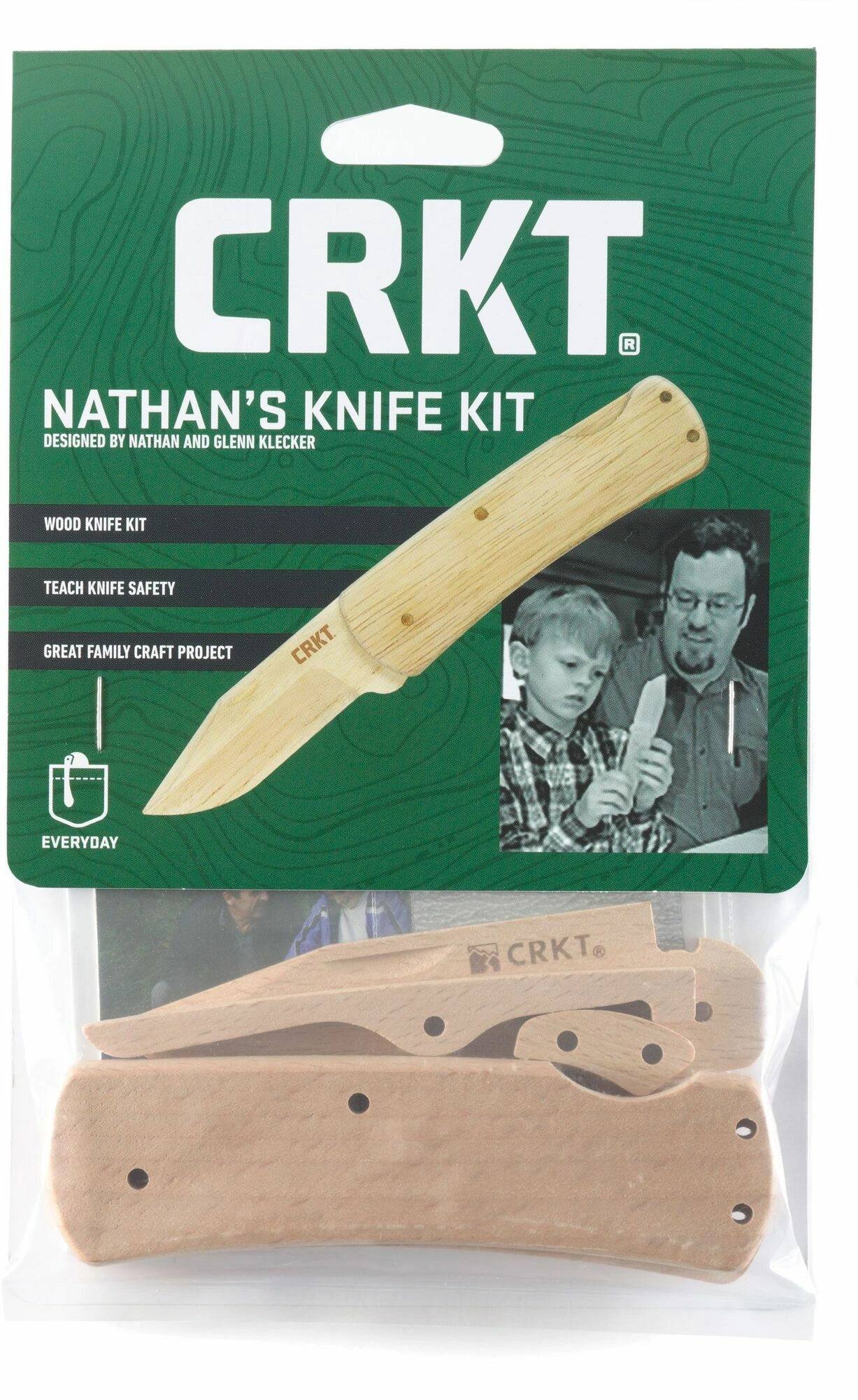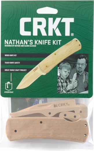 Apprenez les principes des couteaux pliants de manière sûre et ludique. Le kit CRKT Nathan's Knife Kit, inspiré par l’idée de Nathan Klecker, âgé de sept ans, comprend des pièces préfabriquées avec trous pré-percés et tout le nécessaire pour l’assemblage. Le montage est simple, ne nécessite aucun outil et aboutit à un modèle de couteau de poche en bois pleinement fonctionnel.
