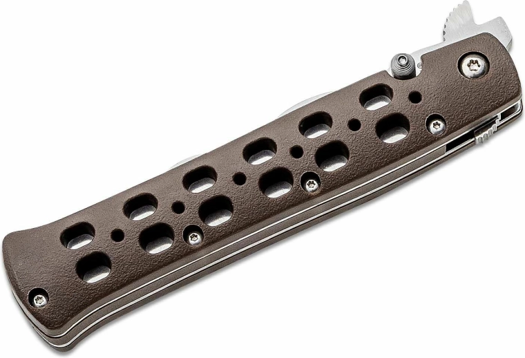 La lame en acier inoxydable japonais AUS-10A avec finition satinée offre un excellent compromis entre tranchant, ténacité et résistance à la corrosion. Le châssis intègre un verrou à ressort robuste Cold Steel avec une résistance déclarée d’environ 66 kg, garantissant une sécurité fiable pour les tâches exigeantes. La poignée ergonomique brune en Zy-Ex est légère, solide et agréablement texturée pour une prise sûre.