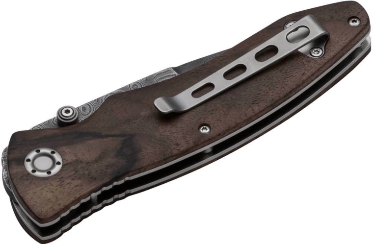 Le manche ergonomique en noyer mat est usiné CNC en structure 3D pour une prise en main sûre et confortable. Le couteau s’ouvre via un téton ambidextre et se verrouille en toute sécurité grâce au Linerlock. Sur la face avant se trouvent les armoiries et le nom Tirpitz, soulignant l’exclusivité et l’origine du couteau. Un clip pratique permet un port discret en poche.