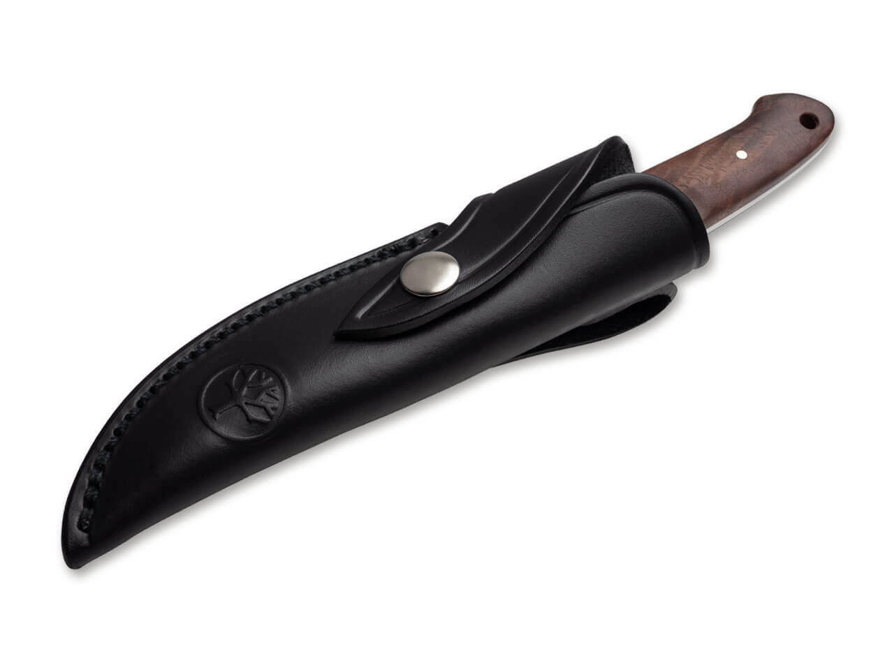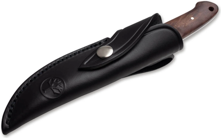 Couteau de chasse et d’outdoor compact de l’atelier BÖKER, forgé d’une seule pièce d’acier (full-tang) pour une solidité maximale. Il offre une lame en acier inoxydable 440C à tranchant lisse, un manche en noyer travaillé à la main et une garde sûre pour protéger les doigts. Livré avec un étui en cuir pour un port confortable.