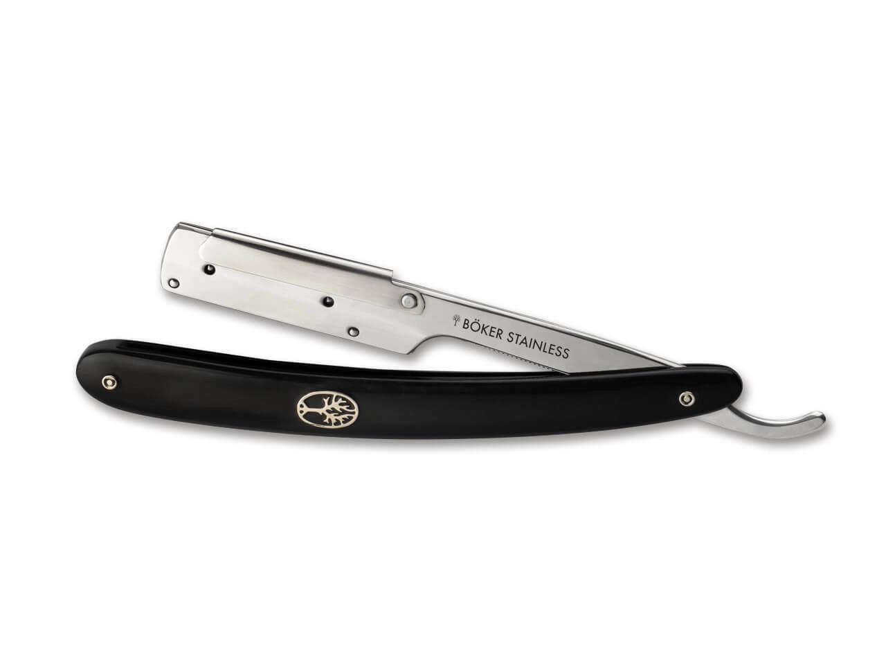 Böker Pro Barberette combine la sensation classique du rasage avec la praticité des lames interchangeables. La demi‑lame double standard (43 mm) est solidement et sûrement maintenue entre deux moitiés en acier inoxydable avec des points de serrage précis. La tête arrondie polie, chanfreinée vers l’intérieur, facilite l’ouverture et le remplacement rapide de la lame.