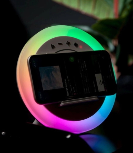 • Solution 3-en-1 : chargeur Qi, haut-parleur Bluetooth et éclairage RVB