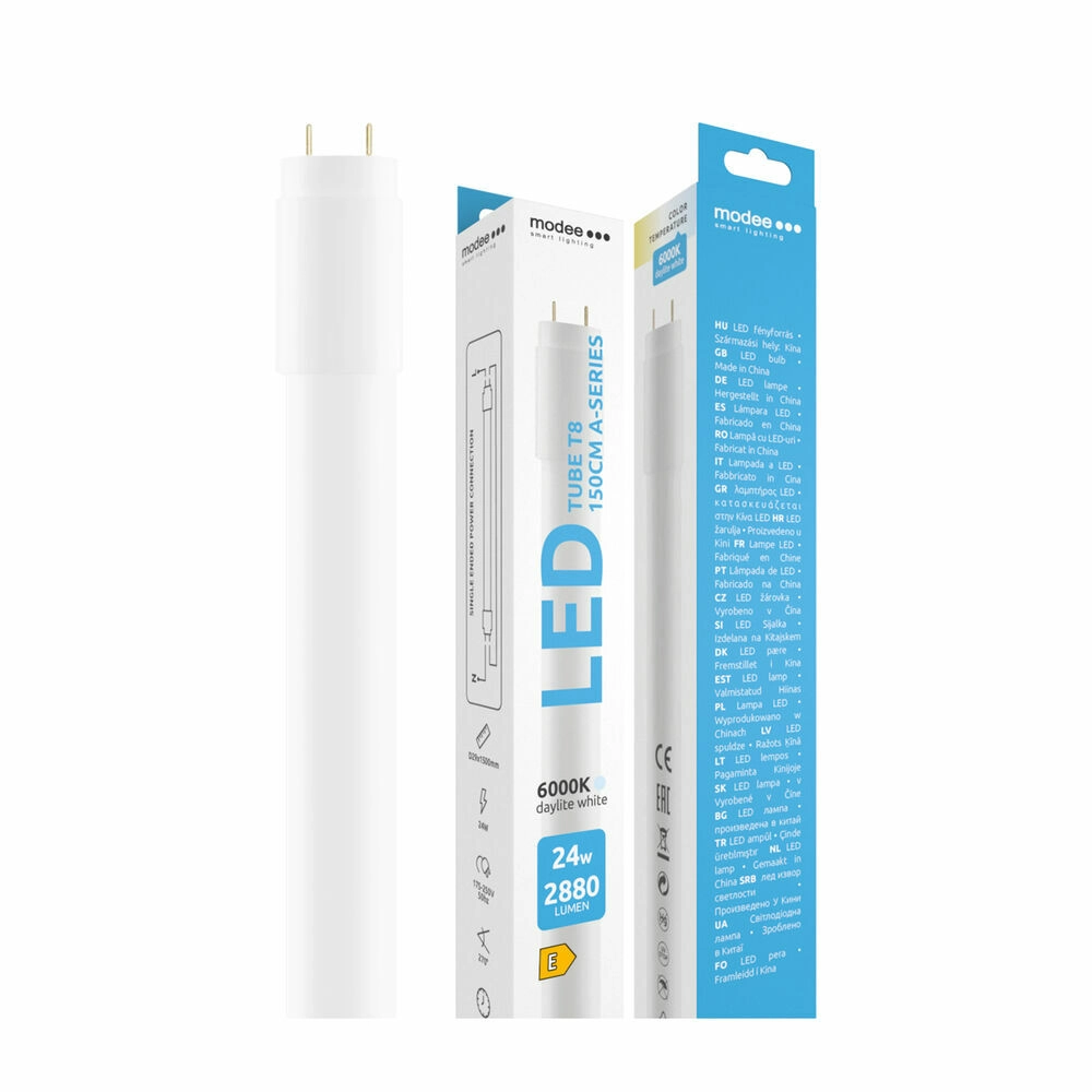 Tube LED T8 économe en énergie de la marque Modee Smart Lighting offrant une puissance de 24 W, une lumière blanc froid 6000 K et un flux lumineux de 2880 lm pour un éclairage clair et uniforme. Idéal pour les bureaux, ateliers et garages exigeant une haute luminosité et une faible consommation.