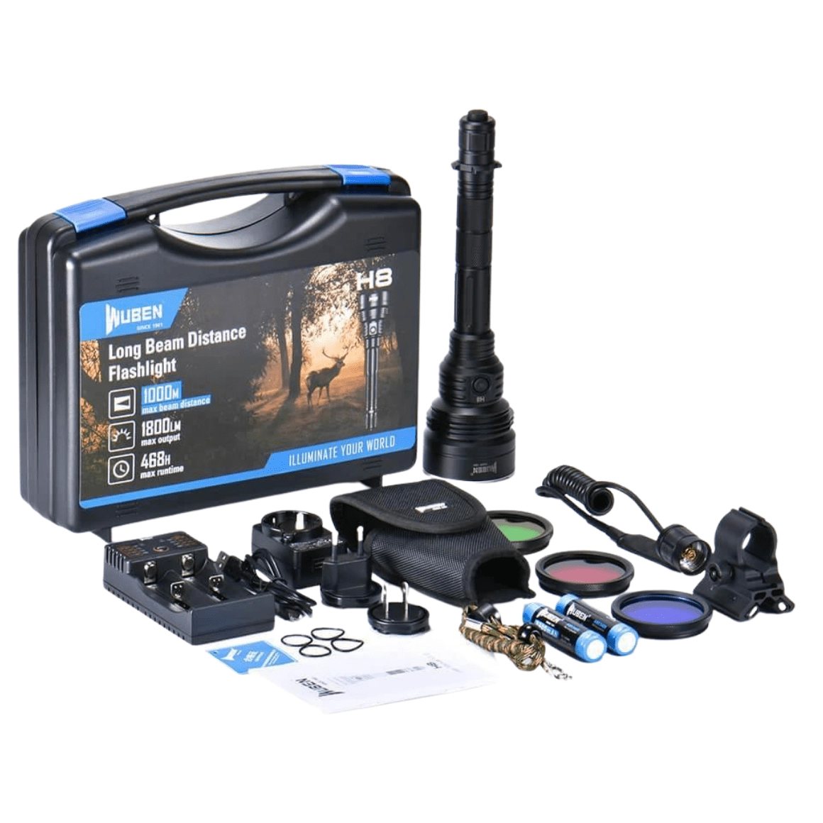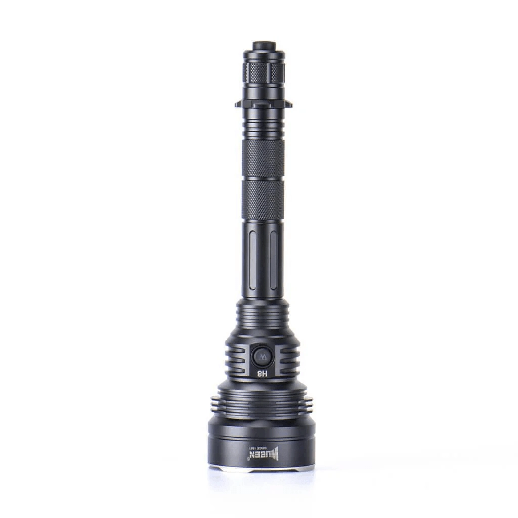 Lampe tactique performante WUBEN H8 avec une portée jusqu’à 1000 m et un flux lumineux de 1800 lm, idéale pour la chasse, le service et les activités de plein air. Corps robuste en aluminium aéronautique A6061‑T6 avec anodisation dure, étanchéité IP68 et résistance aux chutes de 1 m pour une fiabilité sur le terrain. Le coffret inclut de nombreux accessoires dont un support magnétique pour arme, un interrupteur déporté et des filtres colorés.