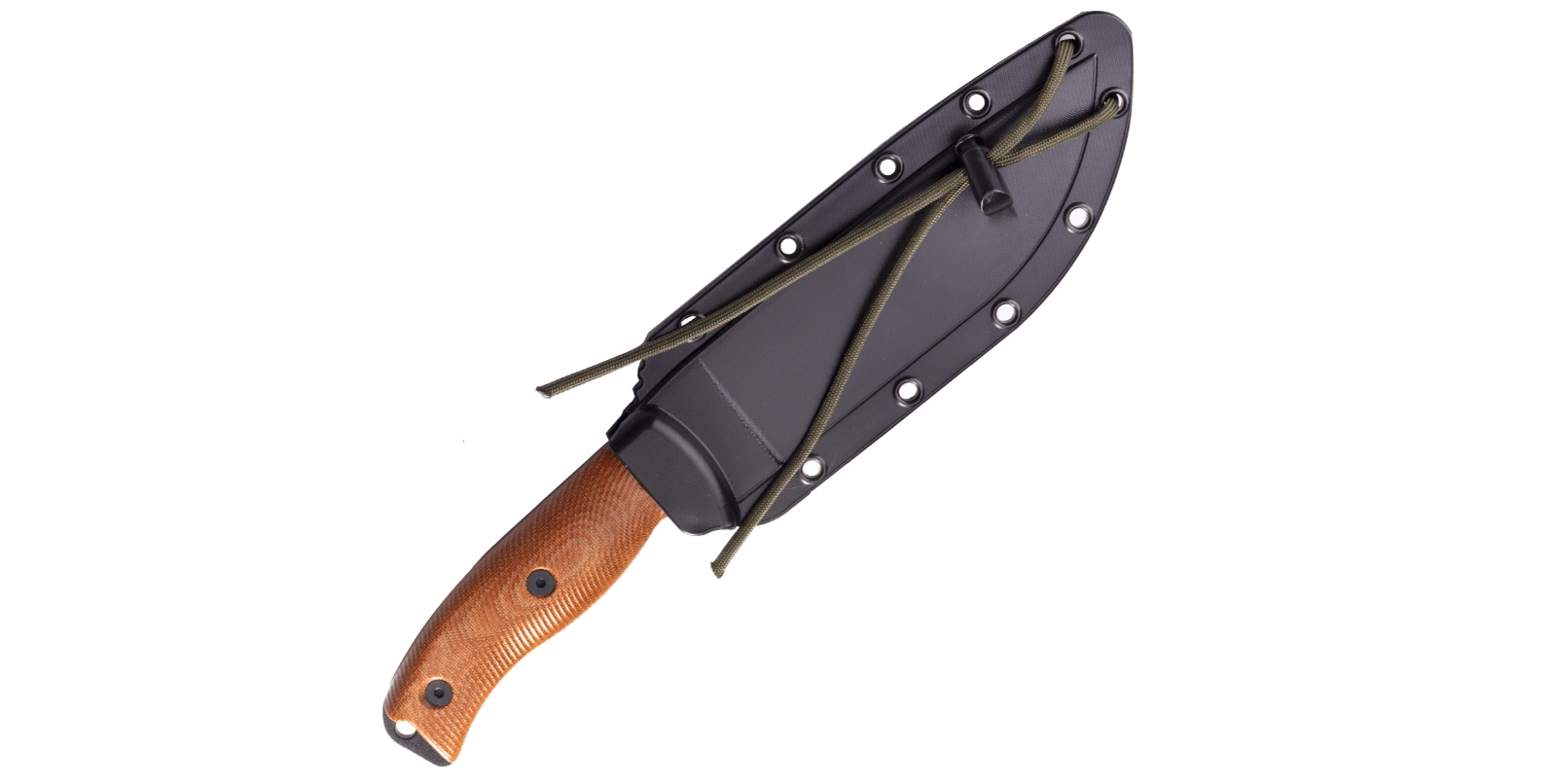 Le manche ergonomique en Micarta à texture marquée offre une prise en main sûre et antidérapante même mouillée. La construction full tang accroît la solidité, le jimping sur le dos et le finger choil prononcé améliorent le contrôle de la lame lors des coupes de précision. Un étui kydex avec de multiples ouvertures est inclus pour un port multi-positions et une fixation sur sac à dos ou équipement.
