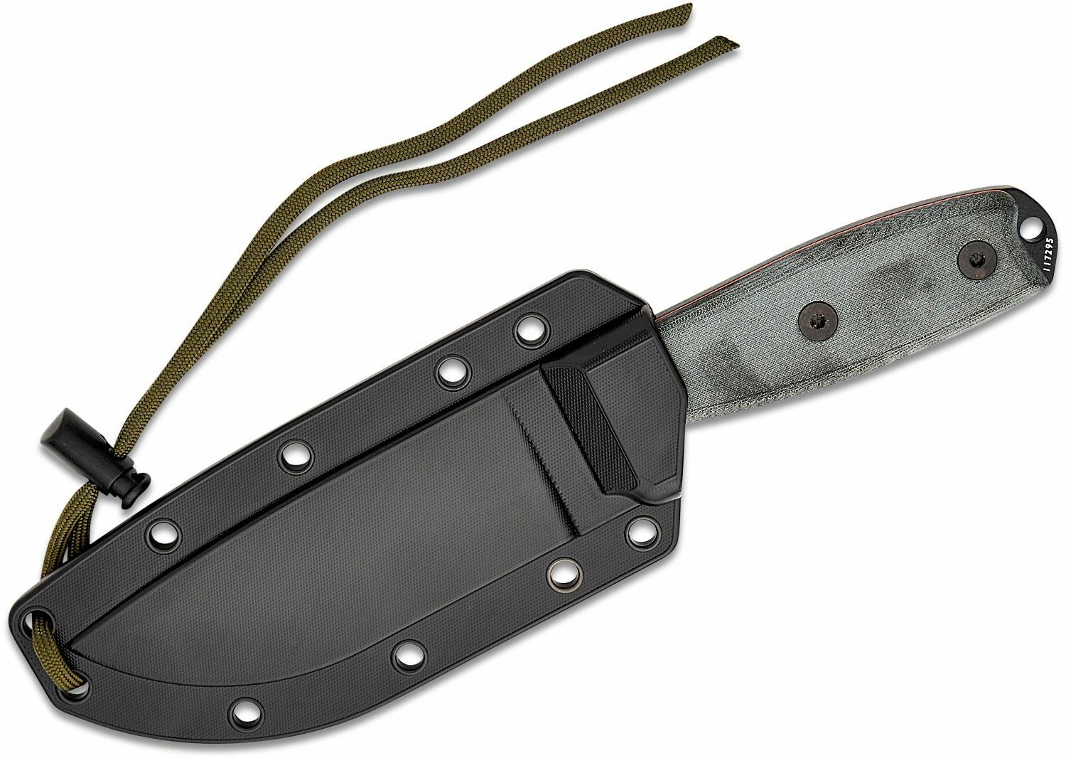 L’ESEE 4S est un couteau fiable conçu pour les conditions exigeantes. Sa lame en acier au carbone 1095 avec revêtement noir offre une grande résistance, une excellente capacité de coupe et un crantage partiel pour couper efficacement sangles, cordes et matériaux fibreux. La poignée ergonomique en Micarta grise tient parfaitement en main et assure une prise sûre même mouillée.
