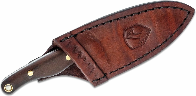 La pointe arrondie augmente la sécurité lors de l’utilisation, ce qui sera apprécié par les débutants et les plus jeunes utilisateurs sous supervision. Le manche profilé en bois de noyer tient parfaitement en main, les plaquettes rivetées assurent la stabilité et l’œillet pour cordon permet une dragonne de sécurité ou un port suspendu. La finition naturelle confère à la lame une résistance et un aspect authentique, tandis que l’étui en cuir permet un port sûr à la ceinture.