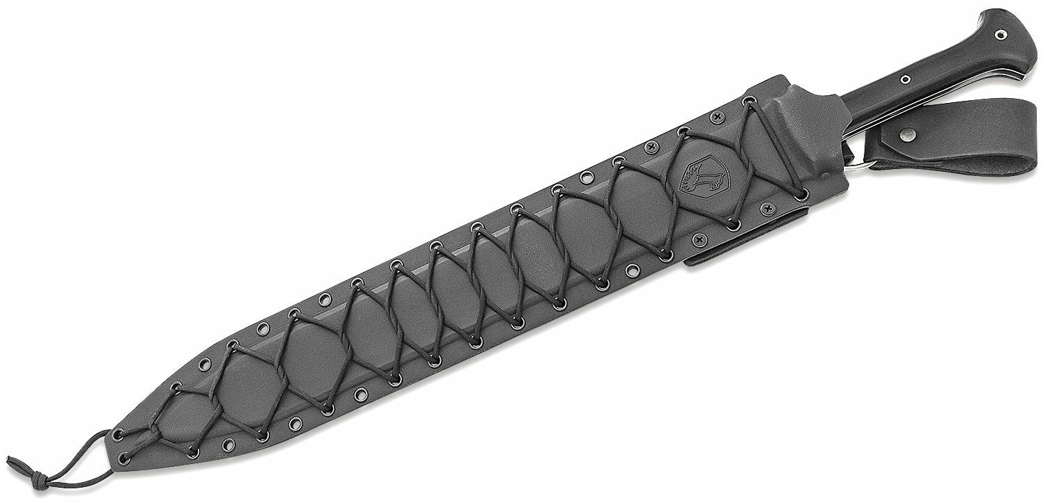 La lame en acier au carbone 1075 avec revêtement noir poudre est affûtée des deux côtés et offre une excellente pénétration ainsi qu’une coupe nette. La construction full tang garantit une grande résistance lors d’utilisations exigeantes, tandis que la poignée en Micarta assure une prise sûre même humide. L’ensemble comprend un étui Kydex avec tressage en paracorde pour un montage polyvalent et un transport sécurisé.