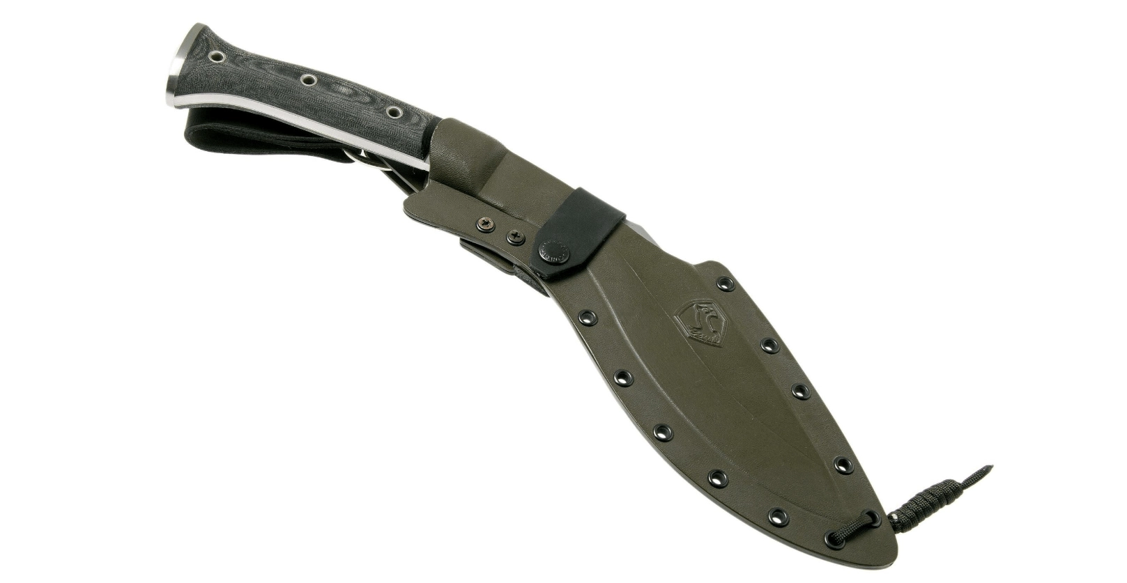 La poignée en Micarta durable, en finition vert armée, est ergonomique et évasée à l’arrière pour une prise plus sûre lors des frappes puissantes. Un rivet creux en bout permet de passer une dragonne de sécurité pour plus de sûreté. L’emballage comprend un étui Kydex moulé avec précision pour un port ferme et silencieux.