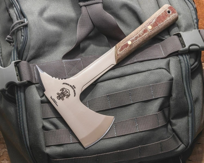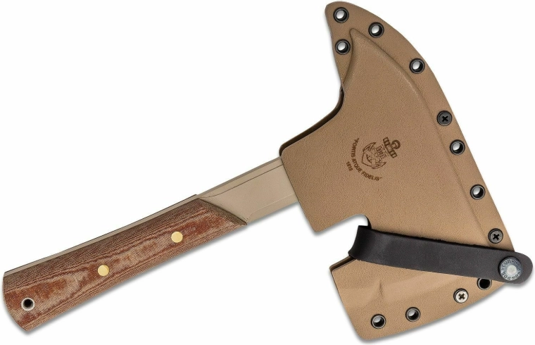 La poignée en Micarta brune offre une prise sûre par tous les temps, avec un trou pour dragonne à l’extrémité pour sécurisation ou suspension. La hache est livrée avec un étui Kydex rigide doté d’une passant/attaches pour un port sûr et un accès rapide.
