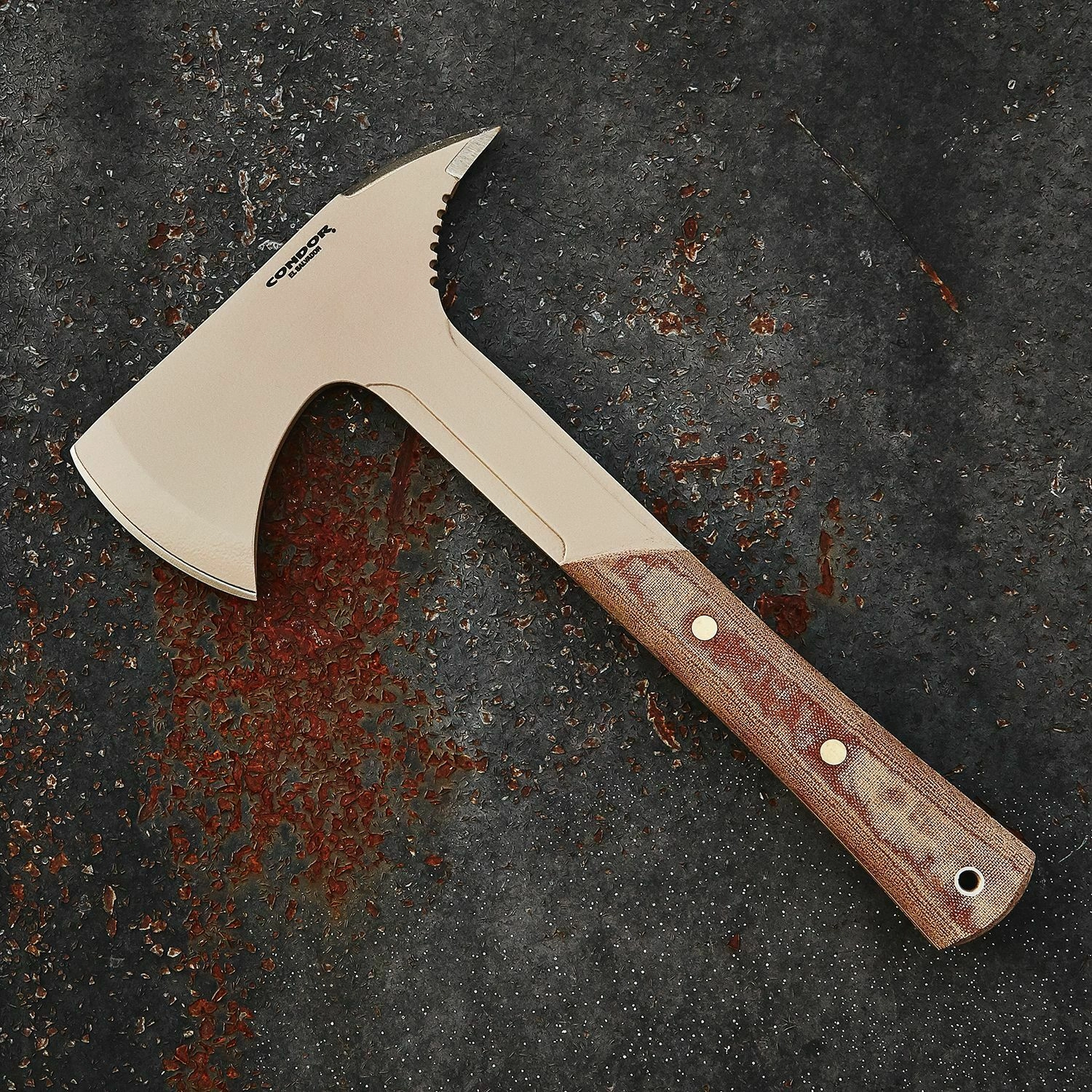 La CONDOR Fortis Fidelis Axe perpétue la tradition des haches navales dans une conception moderne. La tête en acier à haute teneur en carbone 1075 avec un revêtement en poudre coloris desert tan assure des performances fiables et une meilleure protection contre la corrosion. La construction full-tang intégrale accroît la solidité et la résistance même lors d’utilisations intensives.