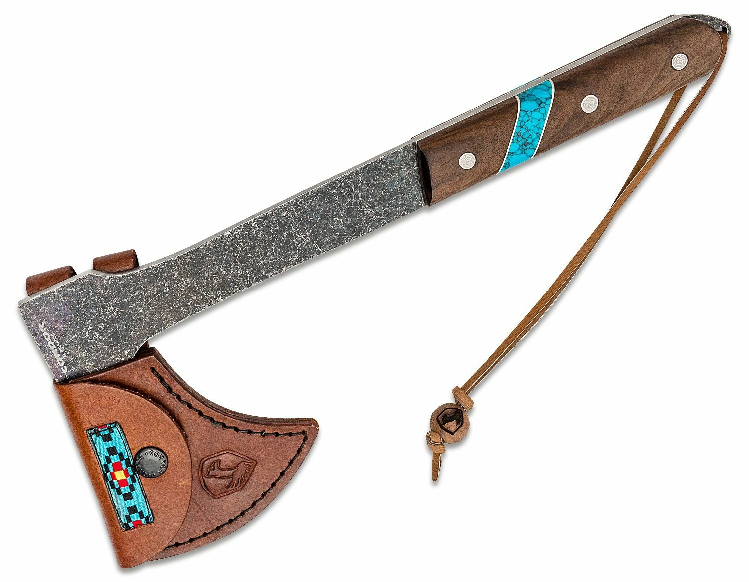 Tomahawk léger et durable pour les activités en pleine nature. Tête en acier au carbone 1075 avec finition naturelle, construction traversante full-tang et poignée ergonomique en bois de noyer avec éléments de pierre turquoise. Étui en cuir de qualité inclus. Idéal pour le camping, le bushcraft et les activités outdoor. Acier au carbone 1075, construction full-tang, bois de noyer, étui en cuir inclus.