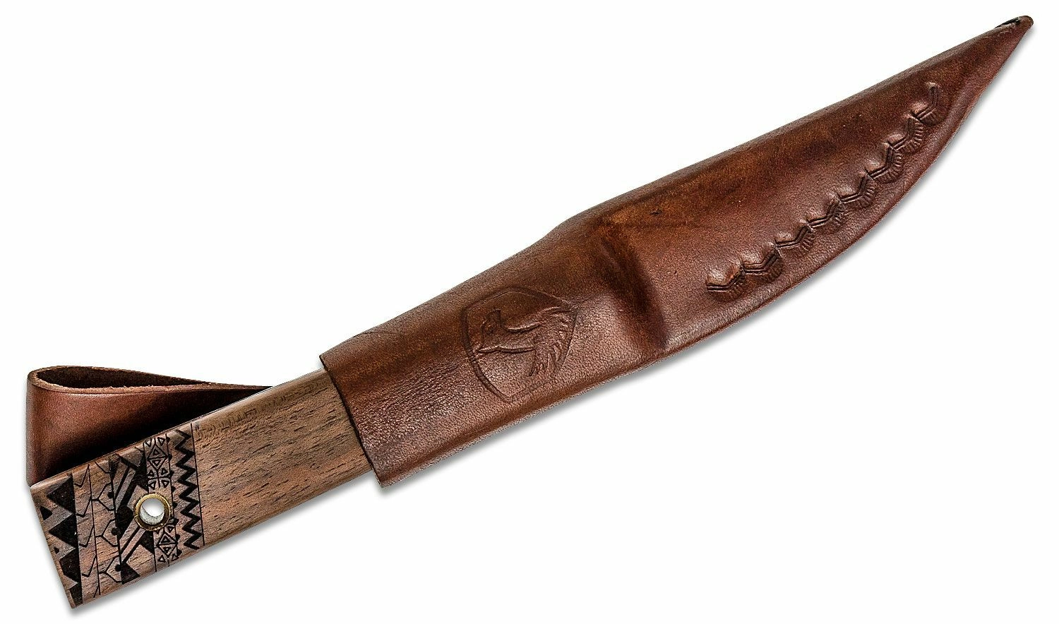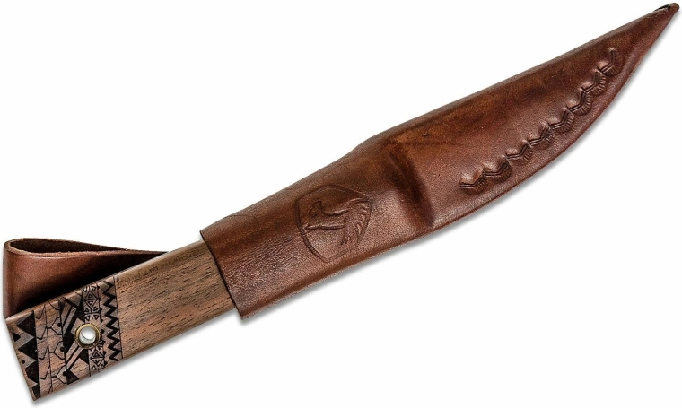 La poignée en bois de noyer tient parfaitement en main et l’enroulement en laiton offre non seulement une allure attrayante, mais aussi une prise plus sûre. L’extrémité ornée de détails gravés et l’œillet pour dragonne ajoutent fonctionnalité et esthétique. L’emballage comprend un étui en cuir de qualité pour un port sécurisé à la ceinture.