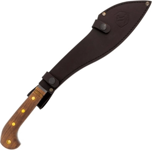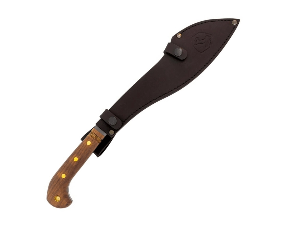 La poignée ergonomique en bois de noyer avec extrémité élargie assure une prise ferme même lors de hachages énergiques. La machette est fournie avec un étui en cuir de qualité pour un port sécurisé et un dégainage rapide sur le terrain.