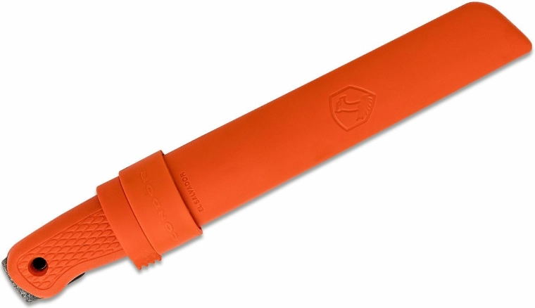 La poignée ergonomique en polypropylène résistant, d’un orange très visible, tient parfaitement en main et possède un trou en bout pour passer une cordelette. Il est livré avec un étui léger et robuste en polypropylène, compatible avec le modèle Bushglider, permettant un port confortable à droite comme à gauche.
